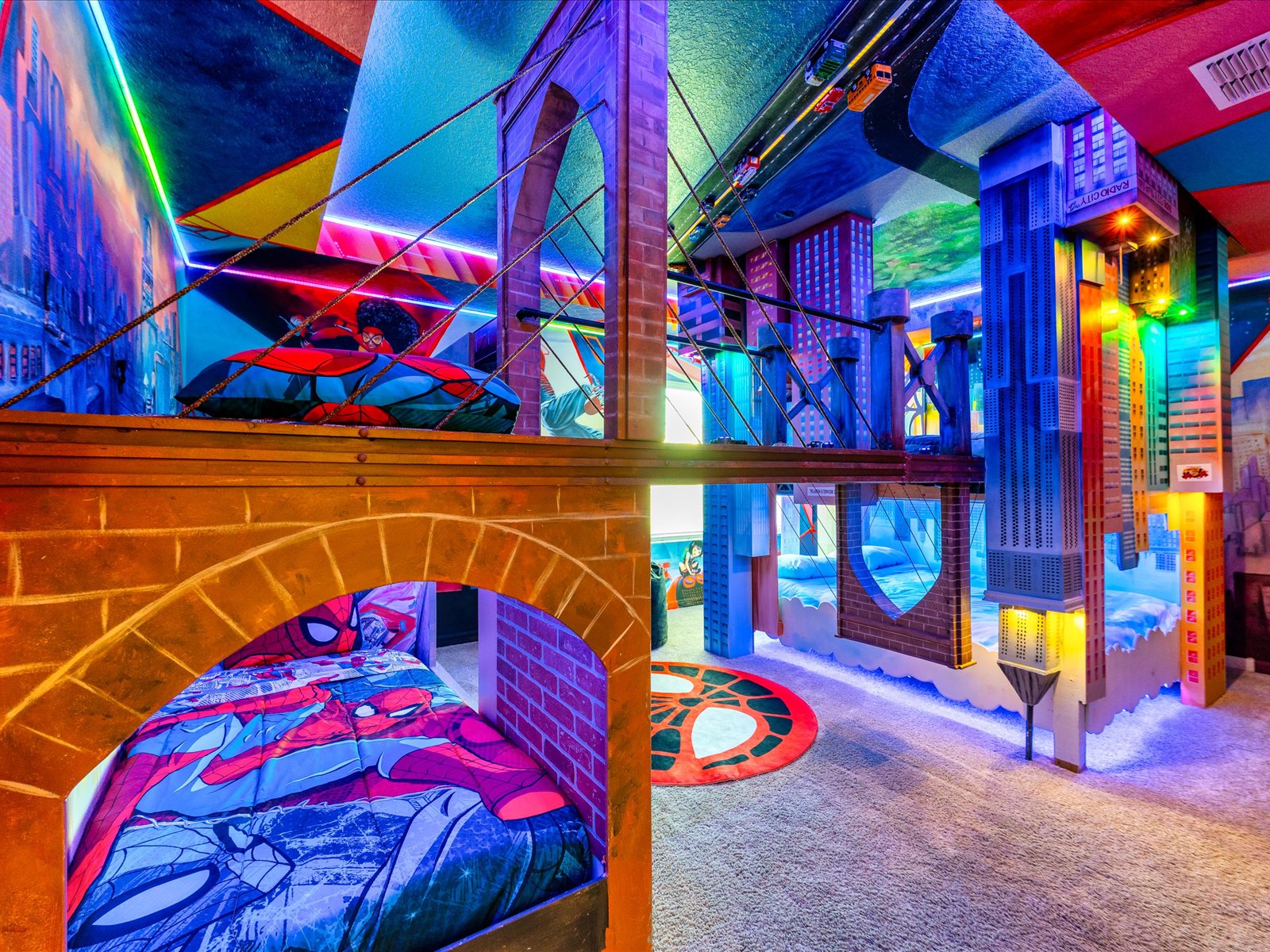 The SpiderVerse House offers a unique experience for superhero fans. Located within SNJ Getaway, this property transports guests into the world of their favorite web-slinging hero.